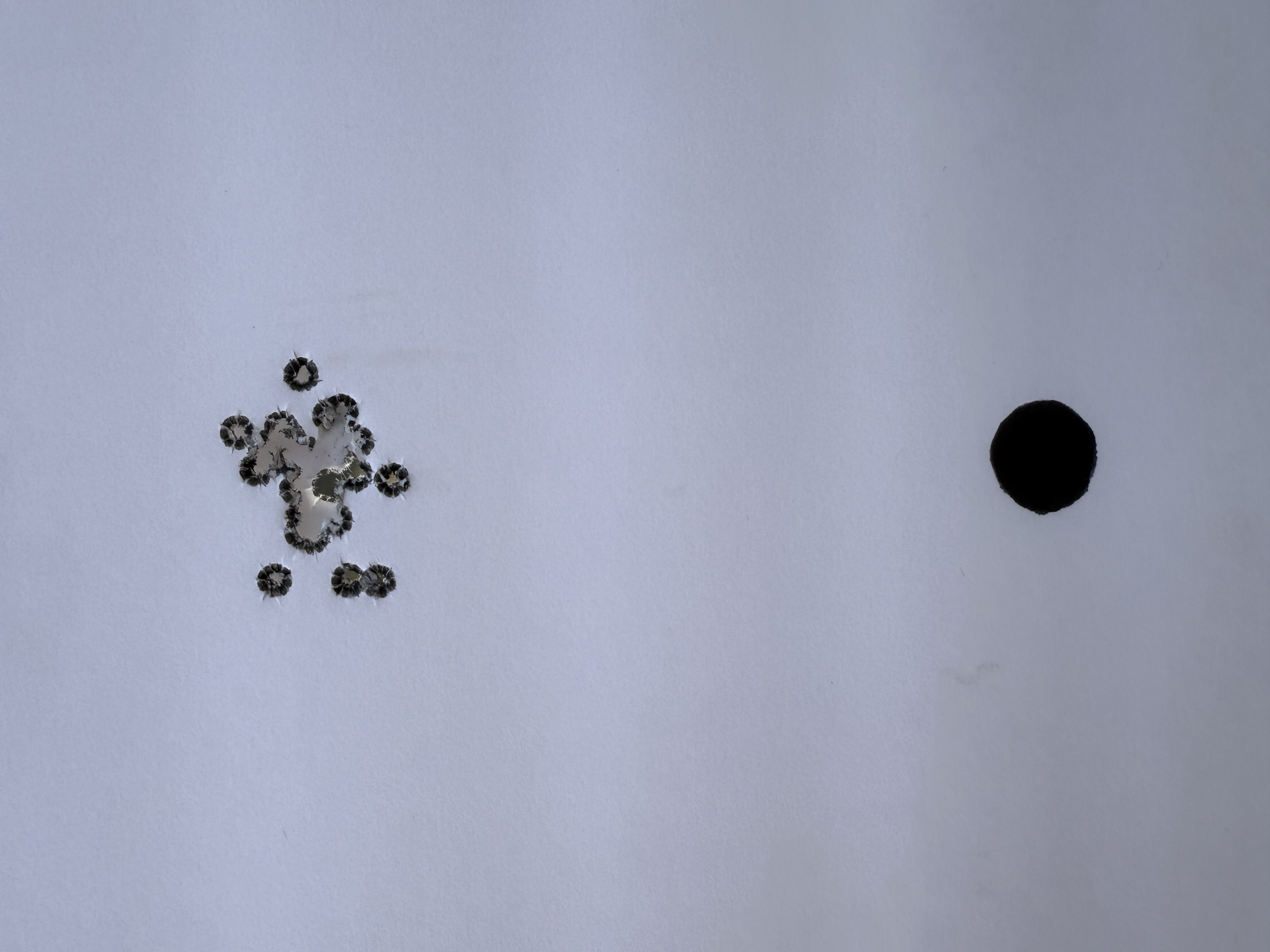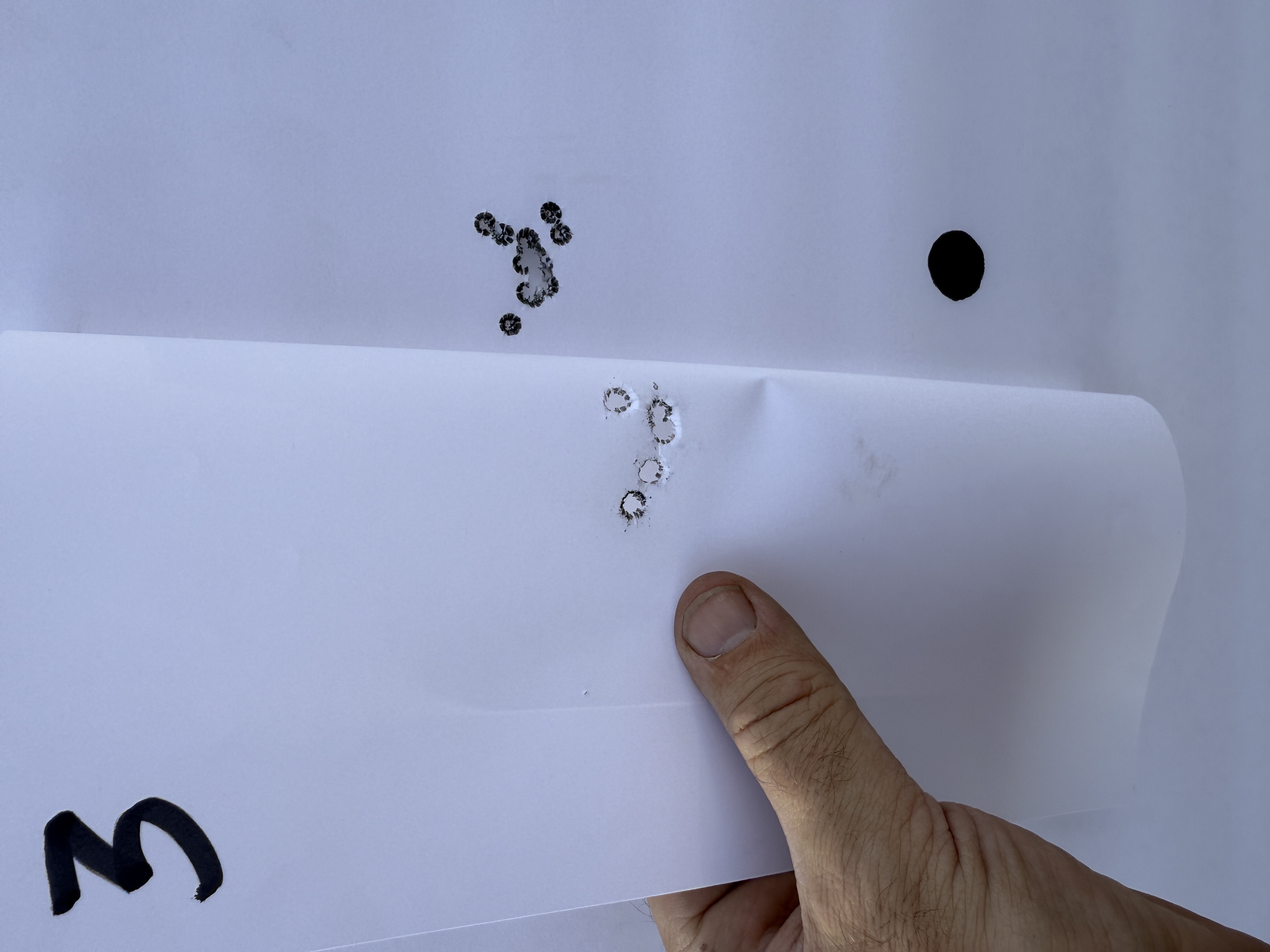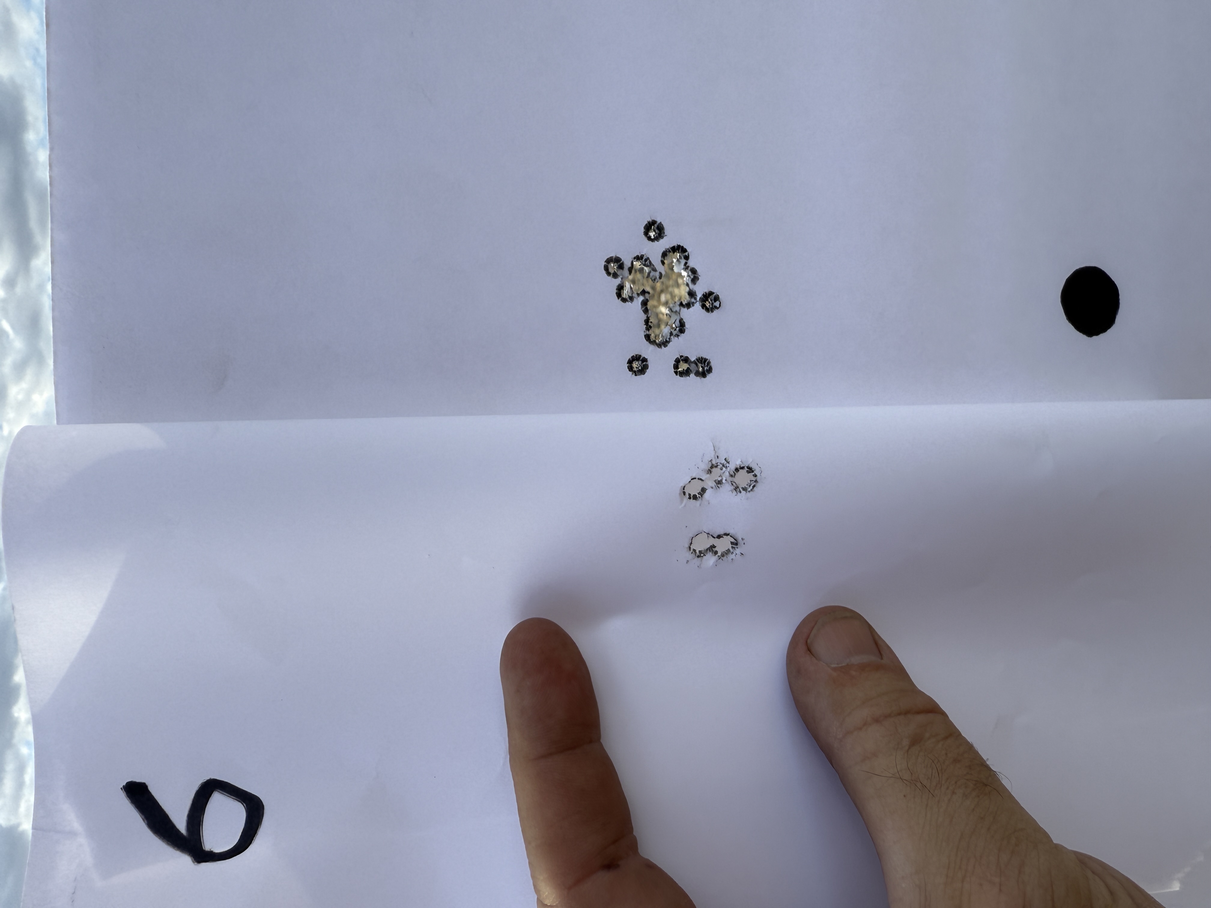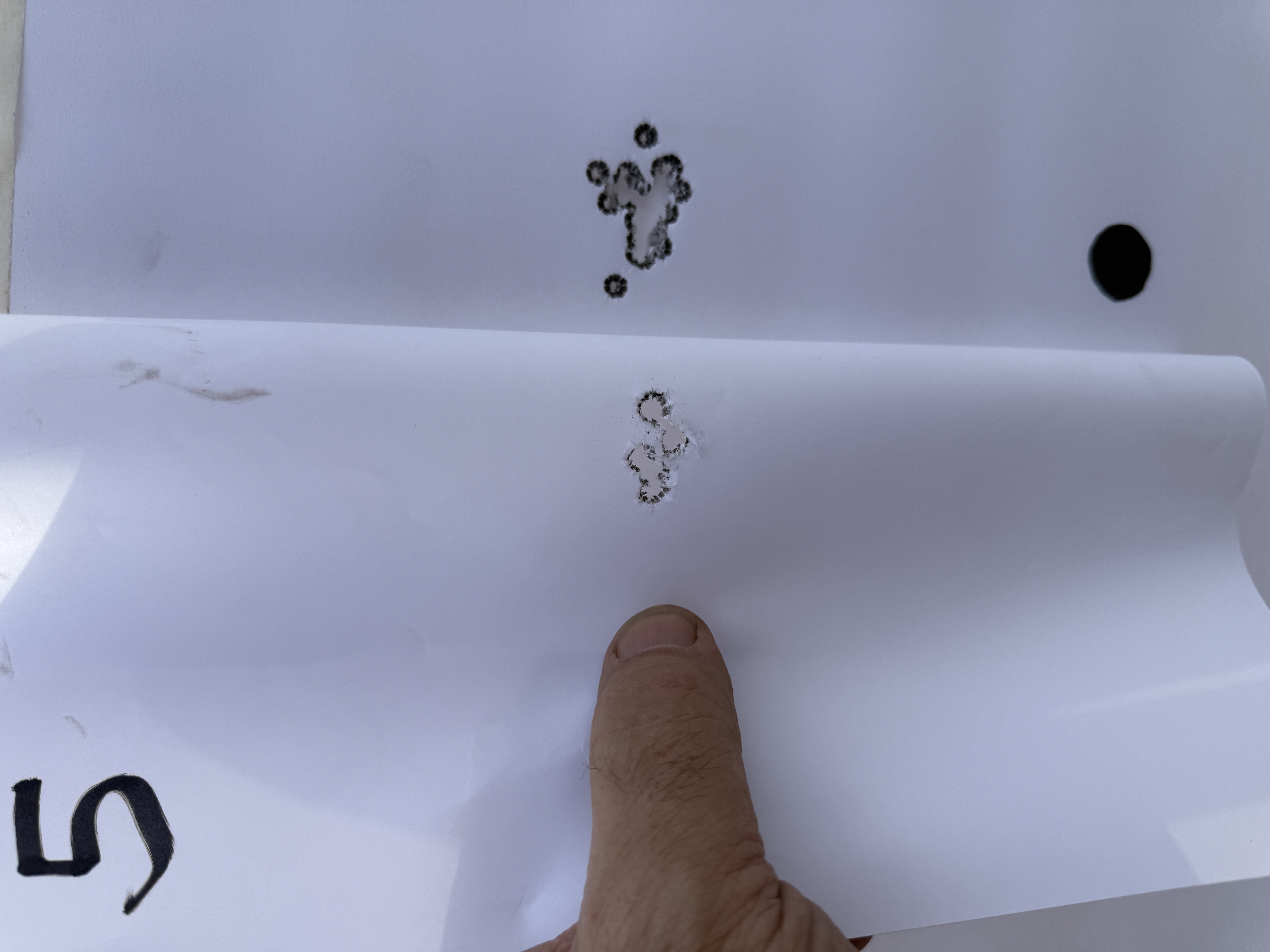 We shot a total of six rounds of 5 shot groups with a cover sheet for each 5 shot group over the same backer.