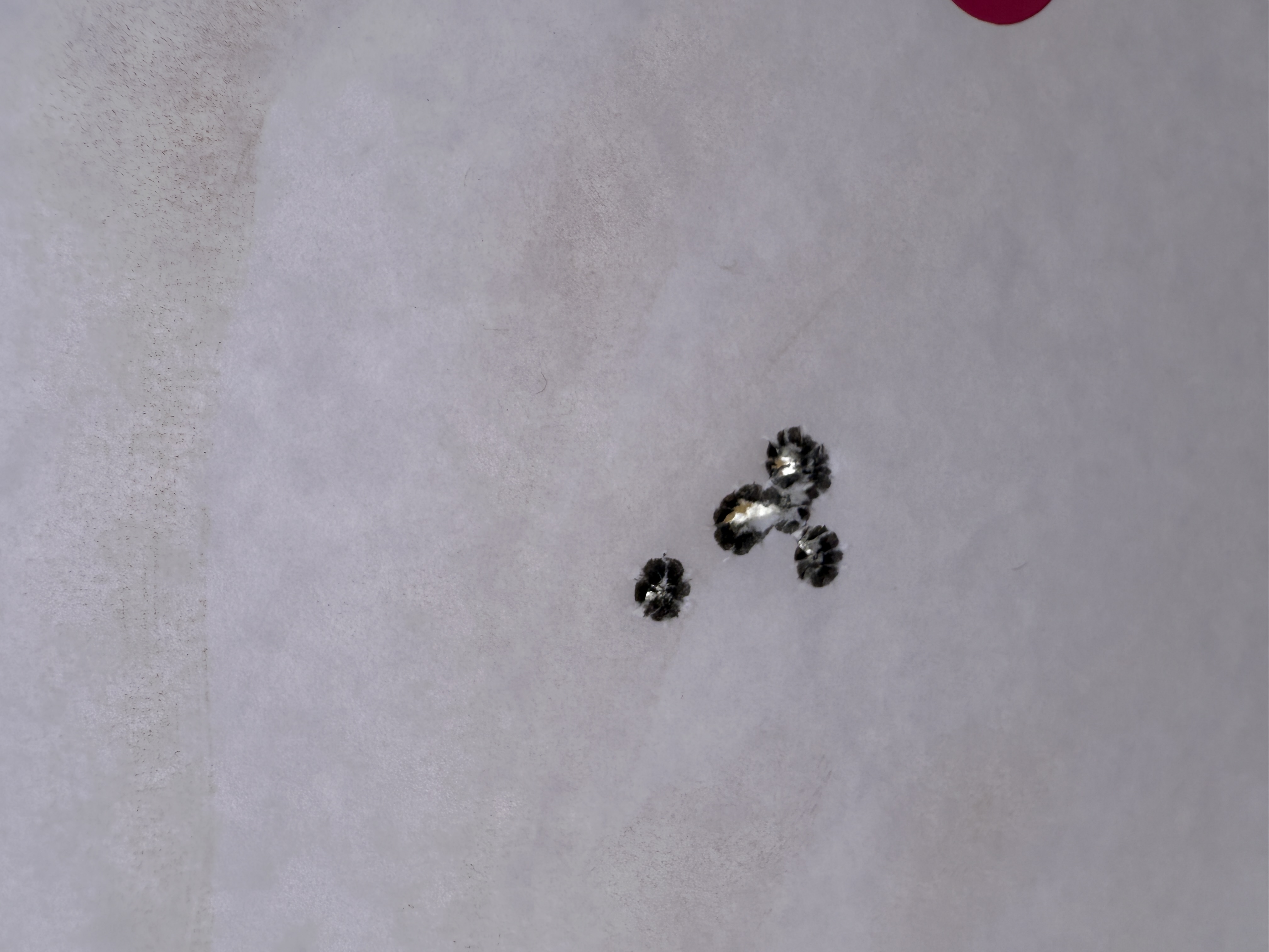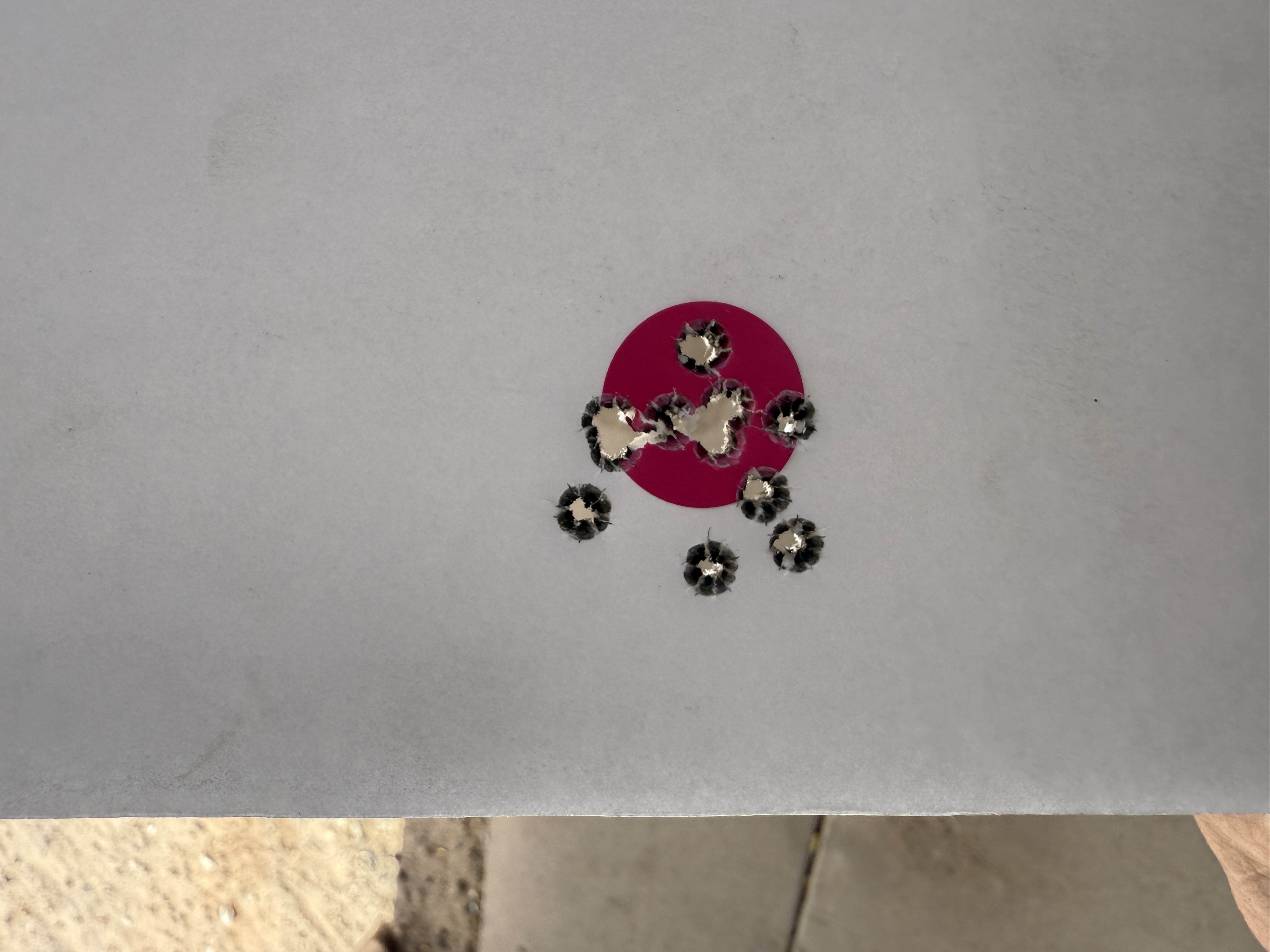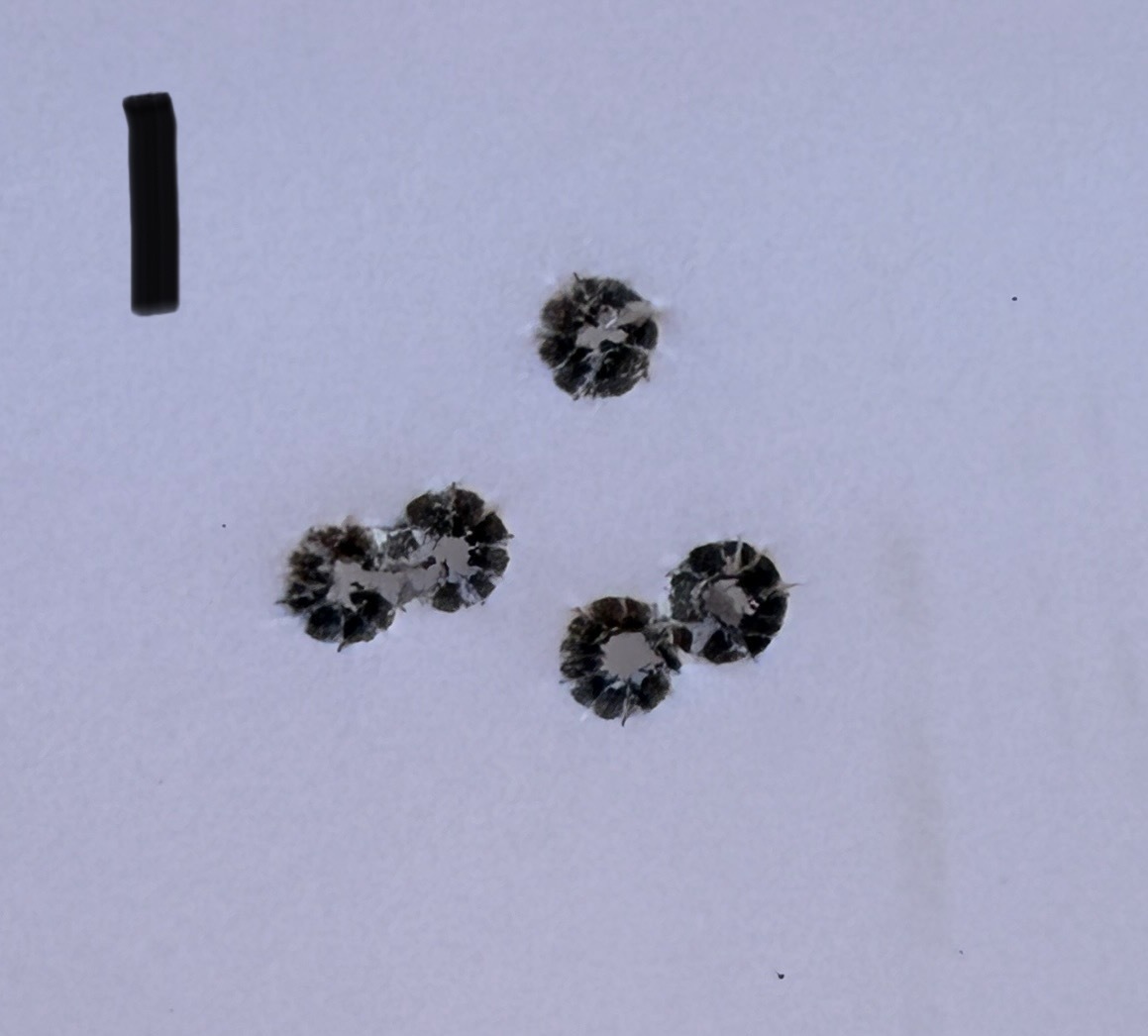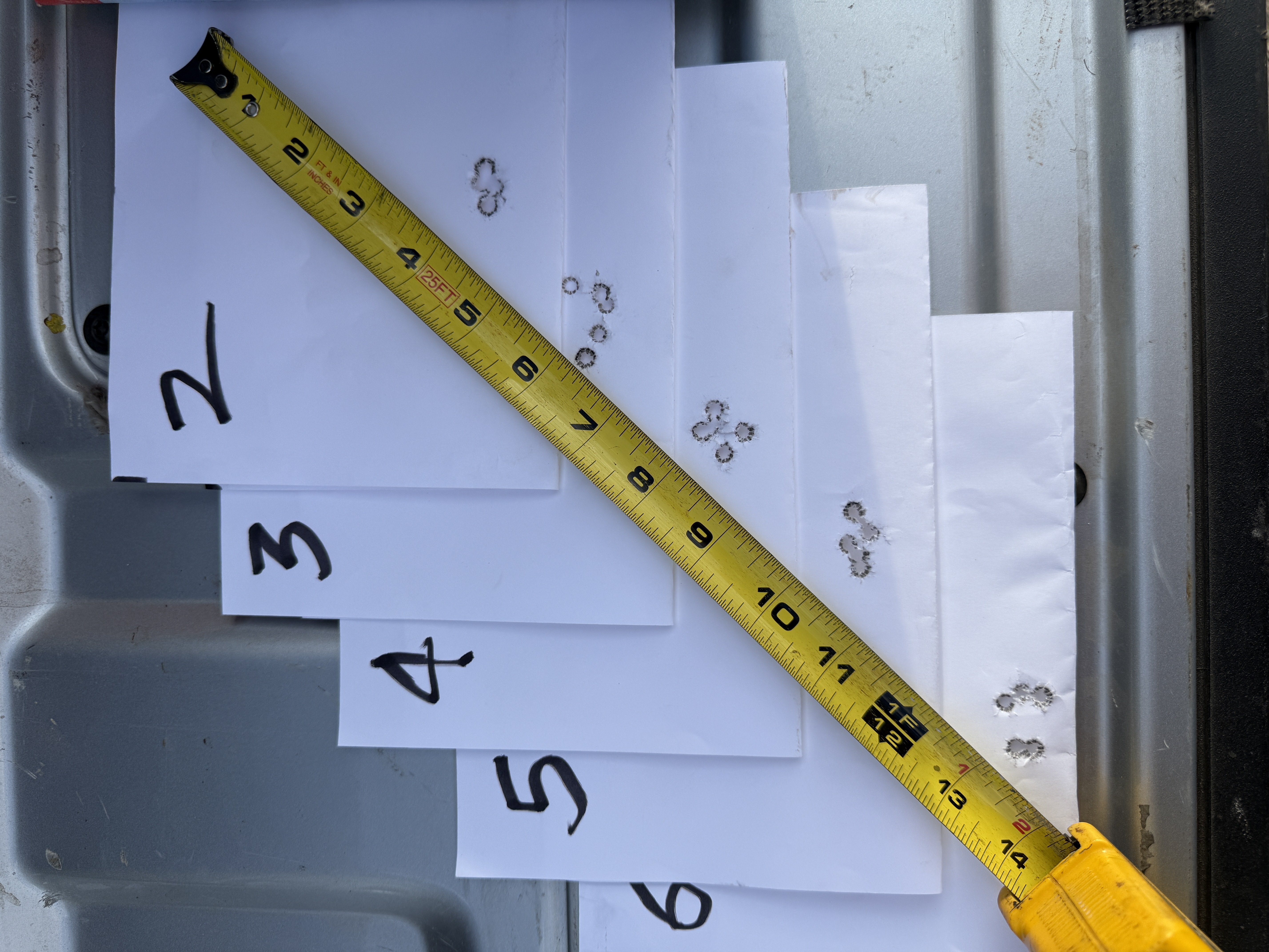We shot a total of six rounds of 5 shot groups with a cover sheet for each 5 shot group over the same backer.