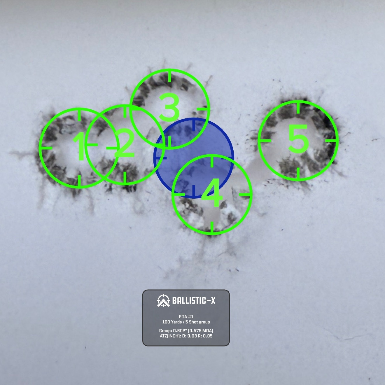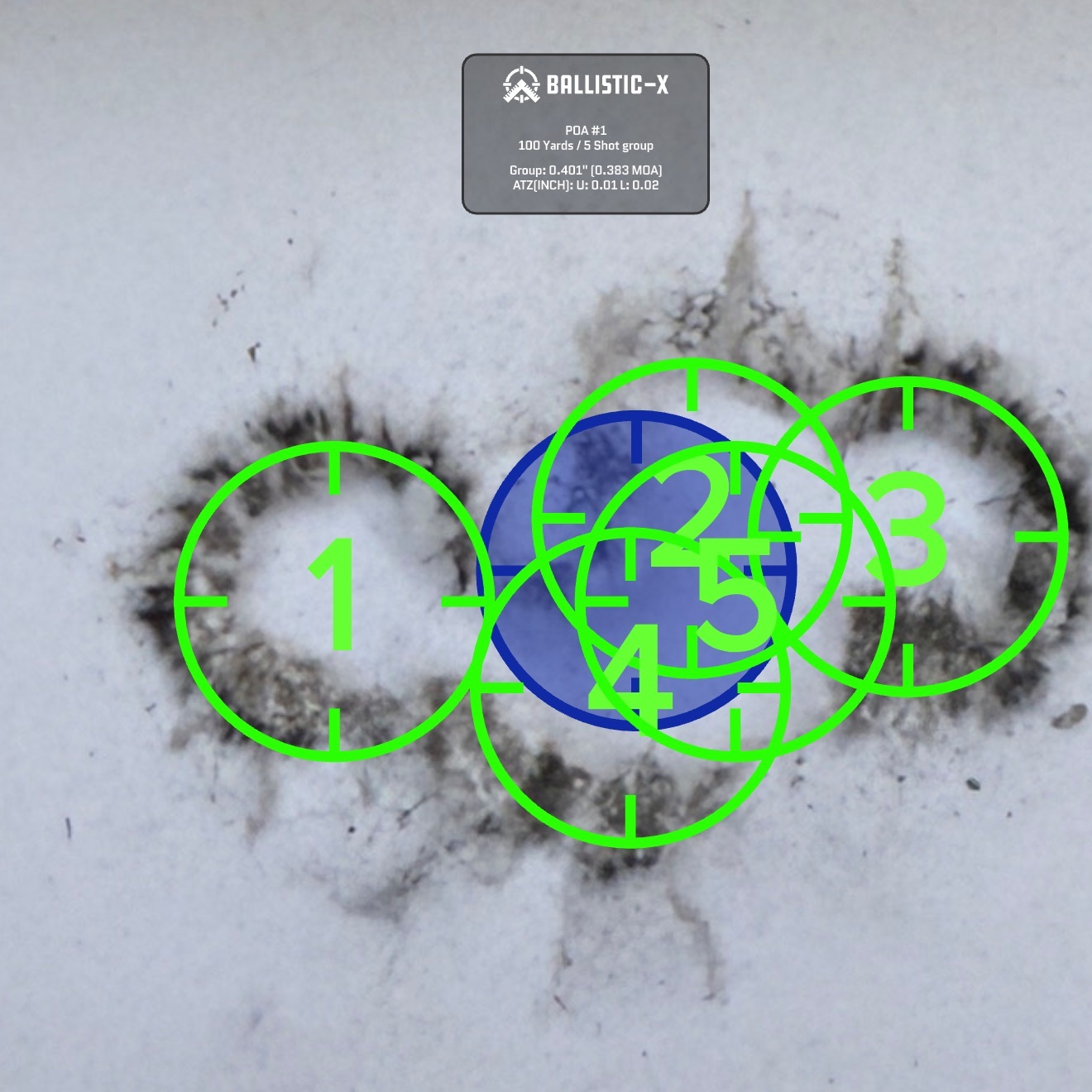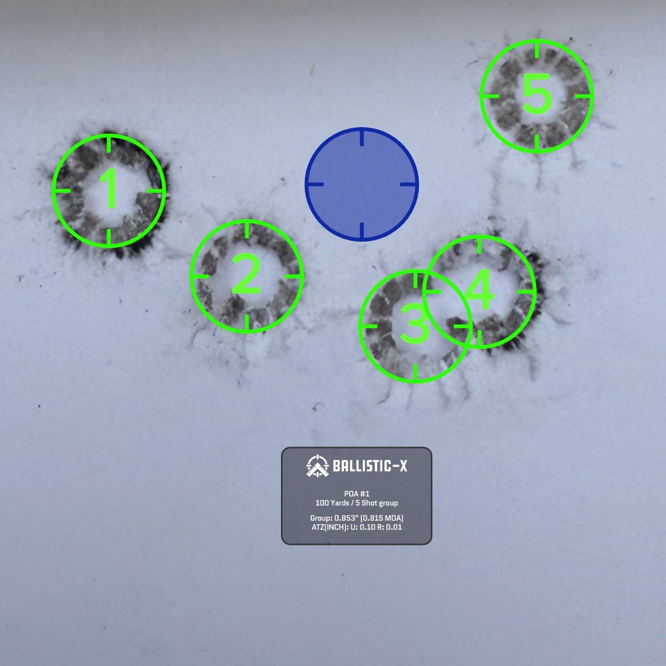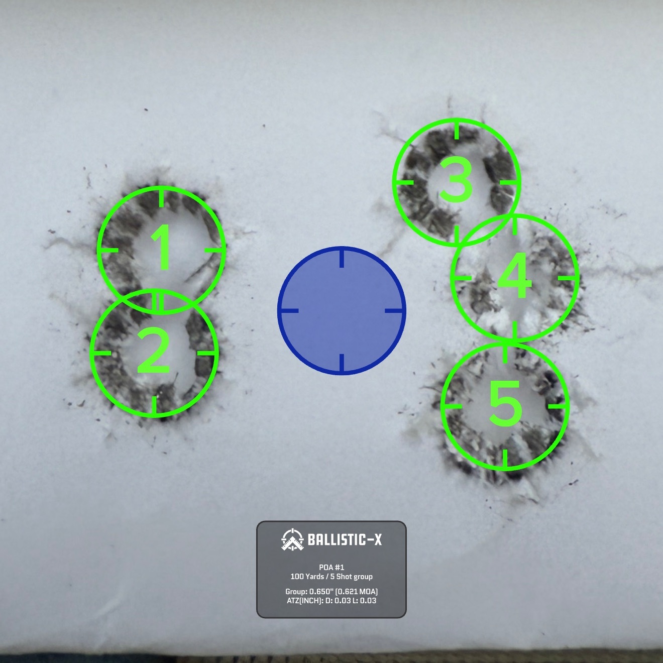 We shot a total of six rounds of 5 shot groups with a cover sheet for each 5 shot group over the same backer.